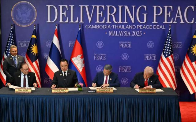 当地时间 26 日,在美国总统特朗普与马来西亚首相安瓦尔的共同见证下,正在马来西亚吉隆坡出席第 47 届东盟峰会的泰国总理阿努廷与柬埔寨首相洪玛奈共同签署声明。声明包括泰柬和平四项协议:撤除重型武器、清除地雷、打击诈骗集团、共同管理边境。