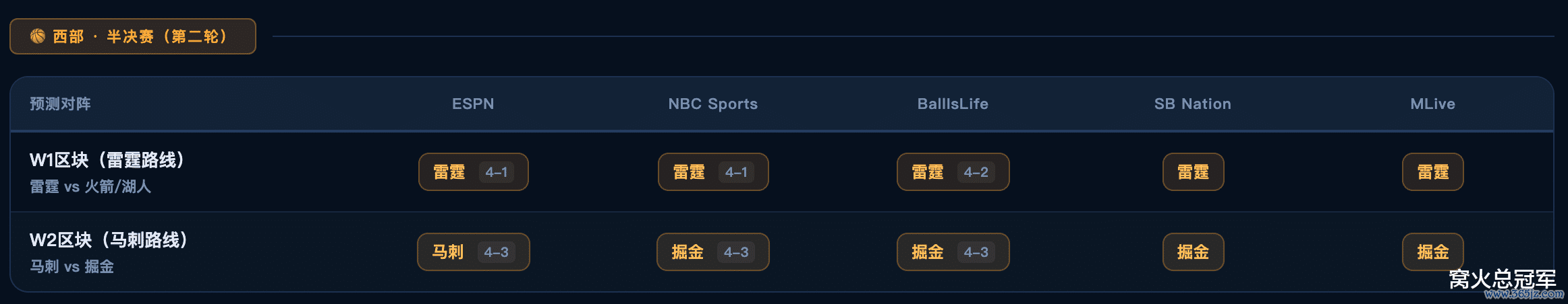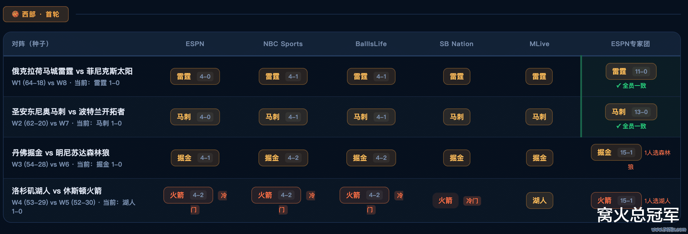 接着西部首轮,终于几大机构有了一丢丢分歧,这边我要说下,尤其是我火和湖人,其实湖人真的很强,但是小李和东77都不打,确实我火占了便宜,但是事实证明,都少了俩大将,(火箭少杜兰特、范乔丹两名主力,海王不能算首发球员)窝火打不过。