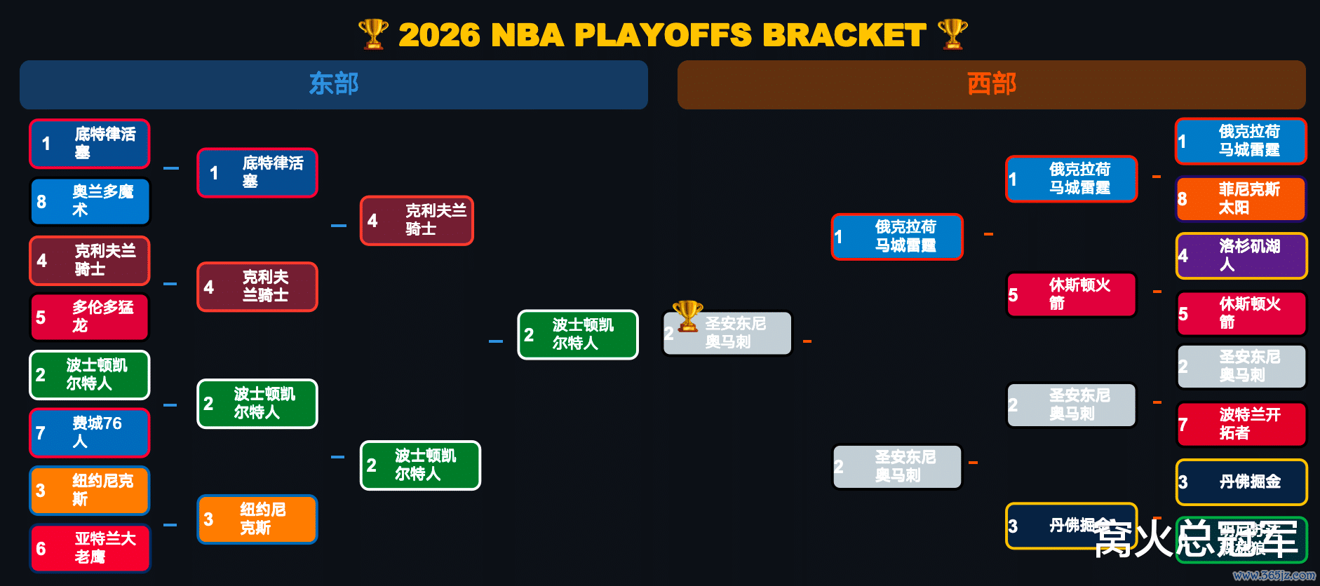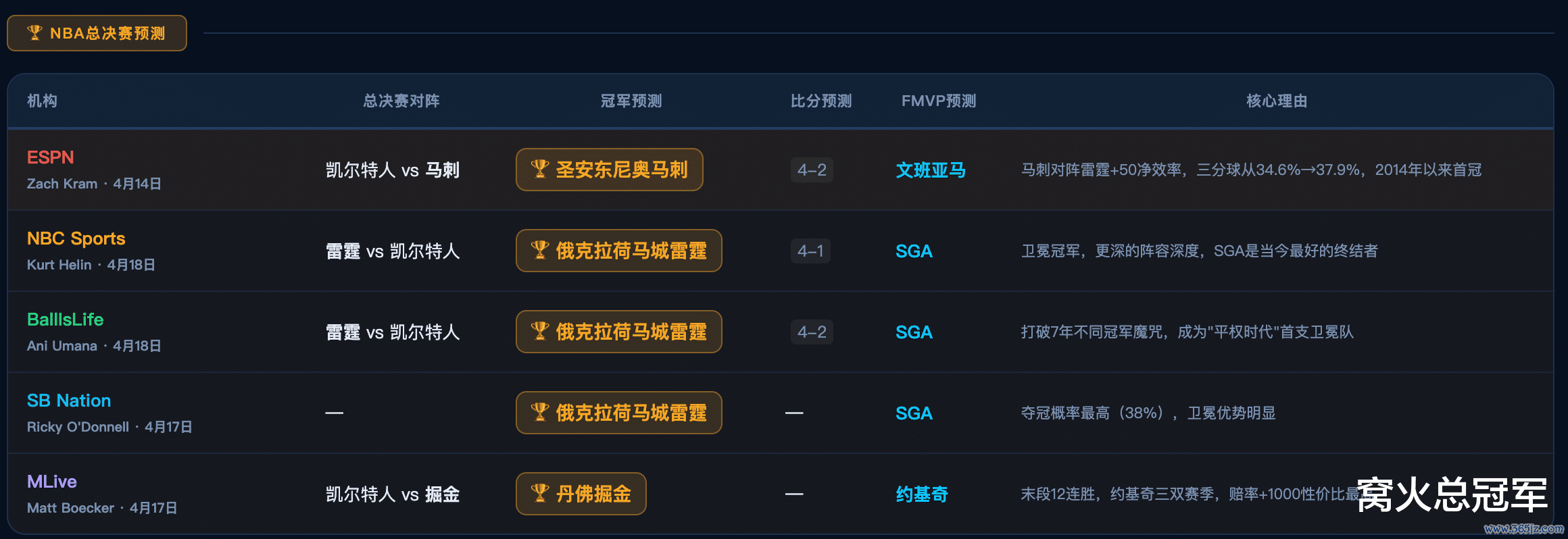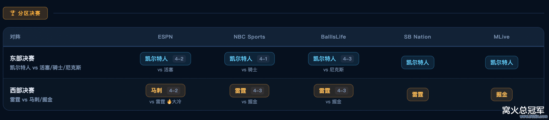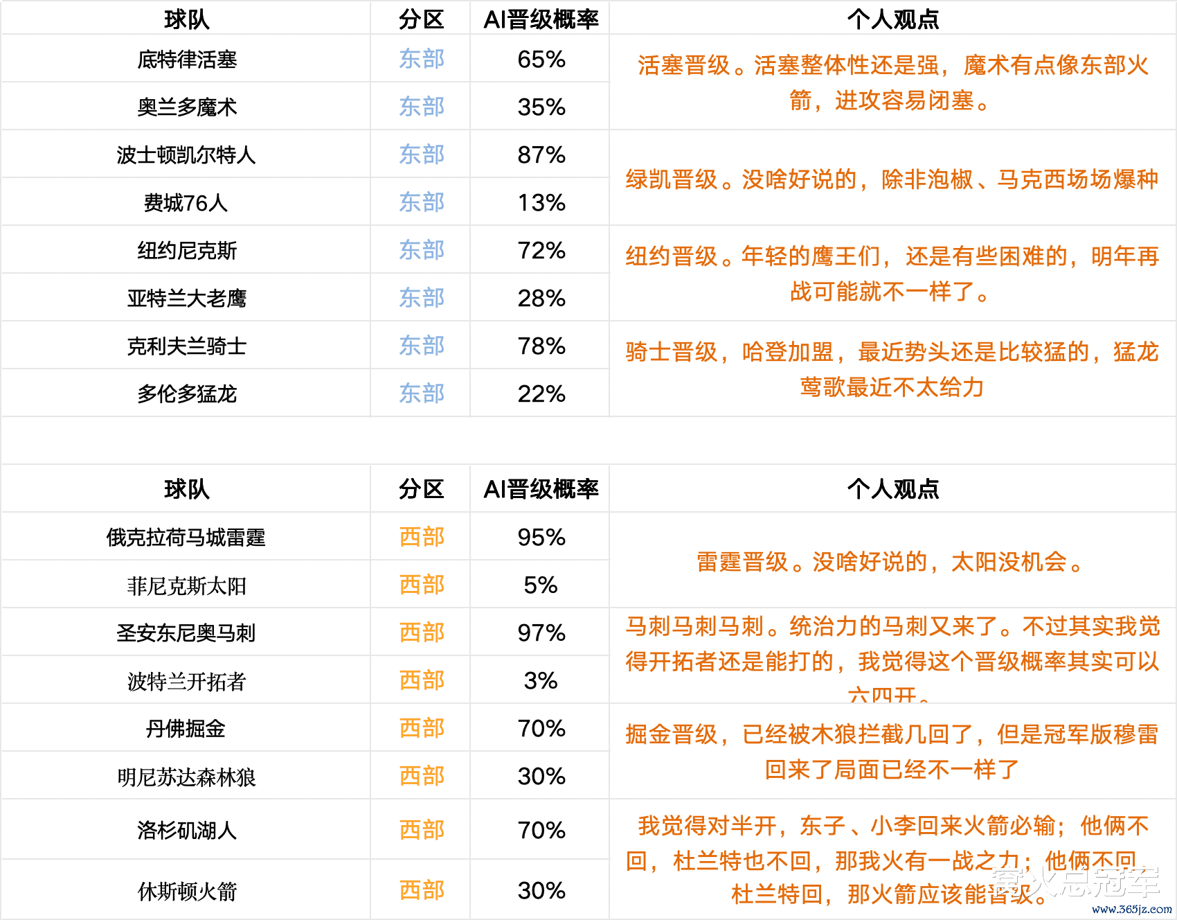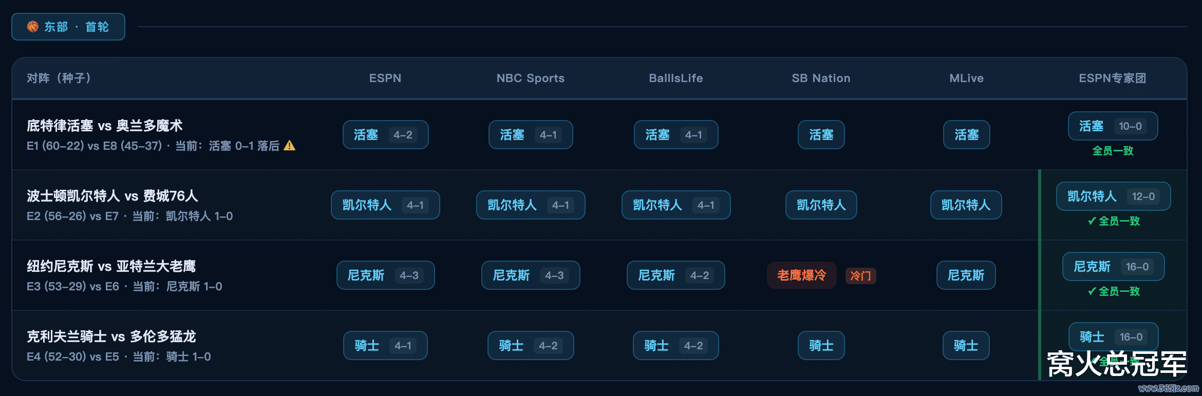 今天搜集了一下各大国外主流网站的信息,给大家总结了一下国外媒体对季后赛的判断。我借助ai整理了一下汇总的概率(但是这个算出来的概率见仁见智吧,我觉得还是有失偏颇的),同时针对首轮补充了我个人的一些观点: