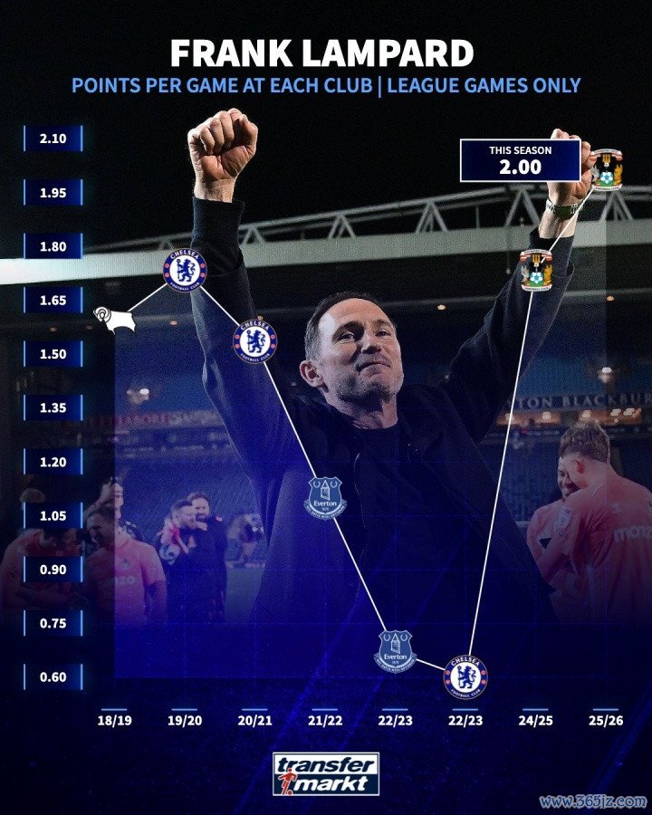 直播吧04月21日讯英冠第43轮比赛,兰帕德麾下的考文垂客场1-1战平布莱克本,提前升级英超。德转列出了兰帕德执教生涯至今各赛季的场均积分,本赛季执教考文垂场均2分创新高。